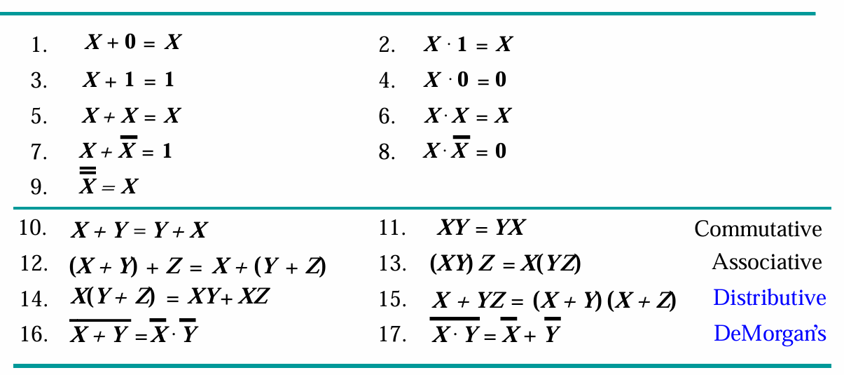 Boolean algebra is an algebraic structure defined on the set {0,1} with three binary operators(AND OR NOT) that satisfies the following basic identities.
