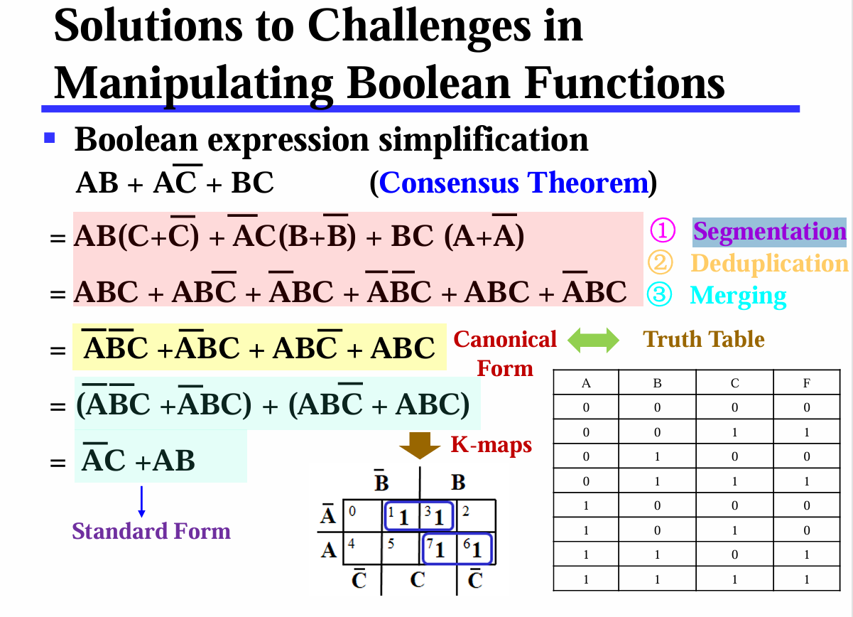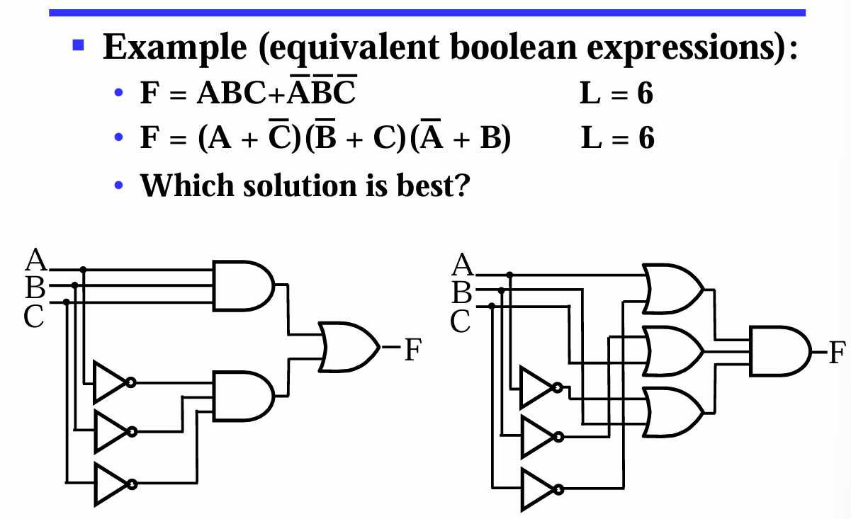 (如果两个布尔函数都写成相同的规范形式(比如都写成最小项之和,且按相同顺序排列),那么只需要比较它们包含的项是否完全相同,就能判断它们是否相等) - provides a starting point for optimization